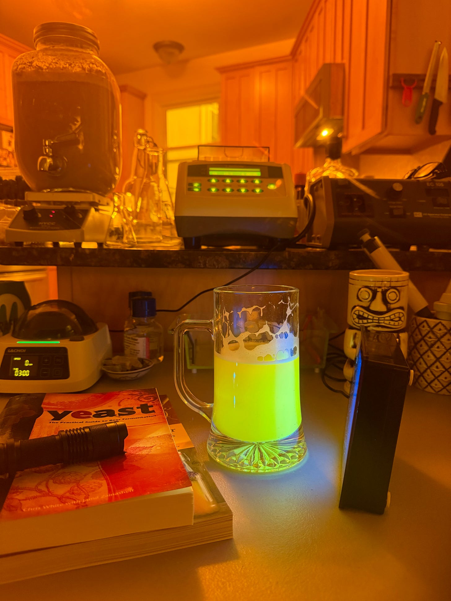 Robust GFP expression was observed in the fermenting beer starting roughly 36 hours after pitching, at which point a pint of fresh beer with suspended live yeast was decanted from the stirred fermenter and immediately consumed at fermentation temperature. At day 3 of the fermentation, the remaining beer was distributed into one-pint flip-top bottles and carbonated by the addition of 1% (w/v) maltose (LabAlley.com).